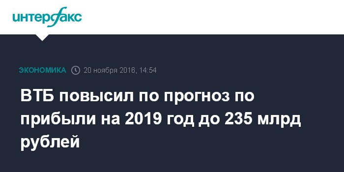 Москва. 20 ноября. INTERFAX.RU - ВТБ повысил прогноз по прибыли на 2019 год до 235 млрд рублей с прежних ожиданий в 200 млрд рублей, заявил глава банка Андрей Костин в интервью телеканалу "Россия 24".
