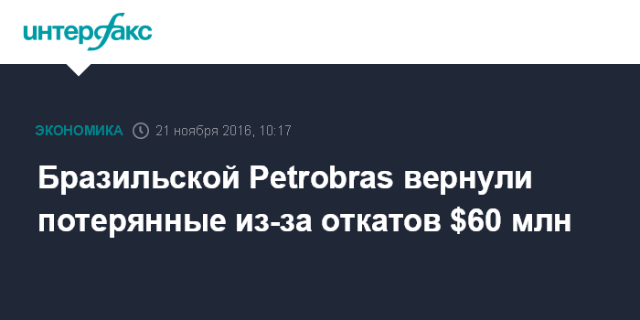 Москва. 21 ноября. INTERFAX.RU - Власти Бразилии в ходе антикоррупционного расследования вернули $60 млн нефтяной госкорпорации Petroleo Brasileiro (Petrobras). Как сообщает BBC, деньги были получены от вовлеченных в коррупционную схему политиков, чиновников и бизнесменов, согласившихся сотрудничать со следствием.