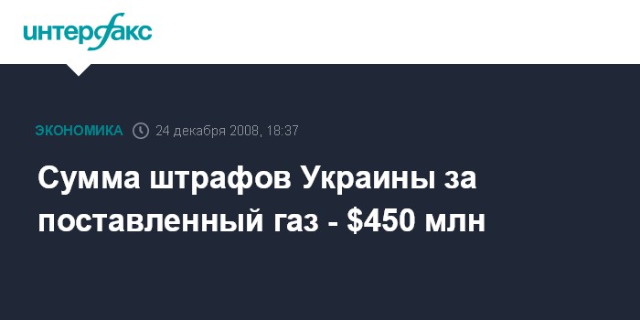 Москва. 24 декабря. INTERFAX.RU - Сумма штрафов Украины за поставленный газ составляет $450 млн, сообщил официальный представитель "Газпрома" Сергей Куприянов на пресс-конференции в Москве.