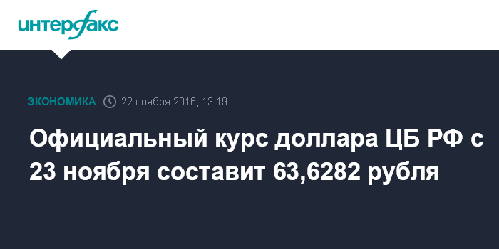 Москва. 22 ноября. INTERFAX.RU - Официальный курс доллара США по отношению к рублю, объявленный Банком России с 23 ноября, составляет 63,6282 рубля, сообщает пресс-служба Банка России. Таким образом, стоимость рубля, выраженная в долларах, по сравнению с предыдущим днем выросла на 1,15%.