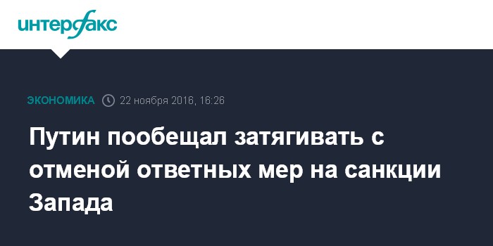 Москва. 22 ноября. INTERFAX.RU - Россия будет как можно дольше тянуть с отменой ответных мер на западные санкции, заявил президент страны Владимир Путин.