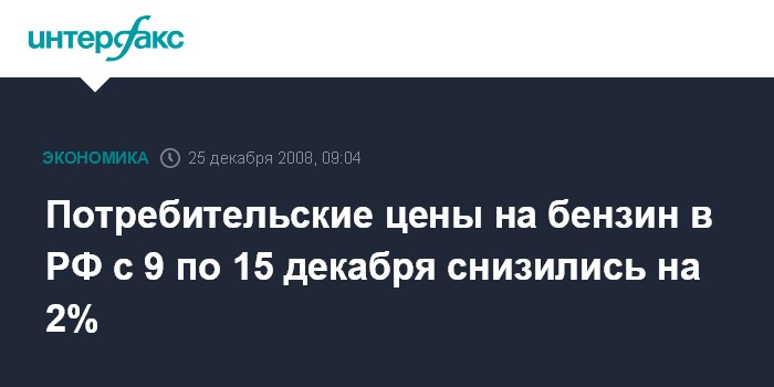 Москва. 25 декабря. INTERFAX.RU - Потребительские цены на автомобильный бензин в среднем по России с 9 по 15 декабря снизились на 2,0%, сообщила Федеральная служба государственной статистики РФ (Росстат).