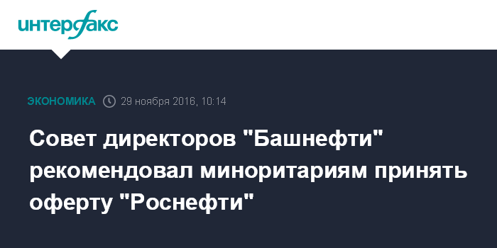 Москва. 29 ноября. INTERFAX.RU - Совет директоров "Башнефти", контроль над которой в октябре получила "Роснефть", рекомендует акционерам принять обязательное предложение "Роснефти" о выкупе акций, говорится в сообщении "Башнефти".