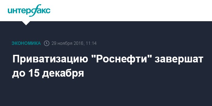 Москва. 29 ноября. INTERFAX.RU - Продажа 19,5% акций "Роснефти", принадлежащих госхолдингу "Роснефтегаз", должна быть завершена до середины декабря, сообщил журналистам помощник президента РФ Андрей Белоусов.