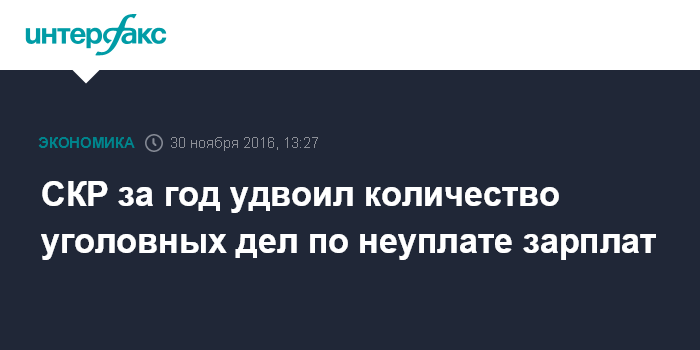 Москва. 30 ноября. INTERFAX.RU - Количество возбужденных уголовных дел по фактам невыплаты зарплаты в стране выросло вдвое, сообщила "Интерфаксу" в среду официальный представитель СКР Светлана Петренко. По ее словам, наибольшее количество сообщений зафиксировано в Центральном и Сибирском федеральных округах. Количество же возбужденных уголовных дел в январе-сентябре 2016 года увеличилось на 85,6% и составило 1 214 дела (в прошлом году - 654 за аналогичный период.
