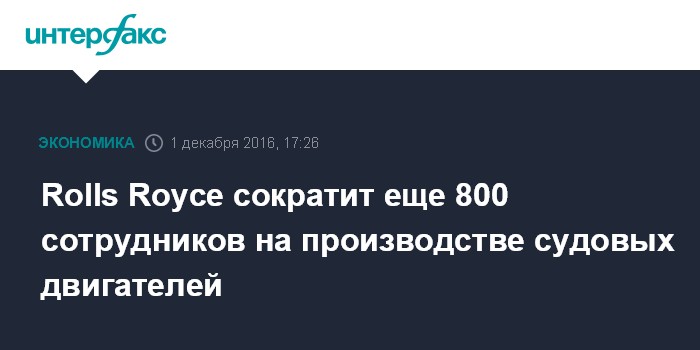Москва. 1 декабря. INTERFAX.RU - Rolls-Royce Group Plc объявила о планах уволить 800 сотрудников в подразделении по производству судовых двигателей в дополнение к сокращению тысячи работников, о котором было объявлено ранее.