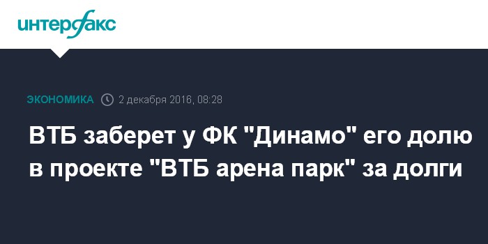ВТБ заберет у ФК "Динамо" его долю в проекте "ВТБ арена парк" за долги