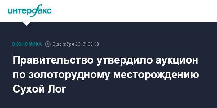 Москва. 2 декабря. INTERFAX.RU - Премьер-министр России Дмитрий Медведев подписал распоряжение, согласно которому в 2017 году будет проведен аукцион на право пользования участком недр федерального значения, включающим месторождение Сухой Лог, расположенным на территории Иркутской области, для разведки и добычи золота и серебра, сообщается на сайте правительства.