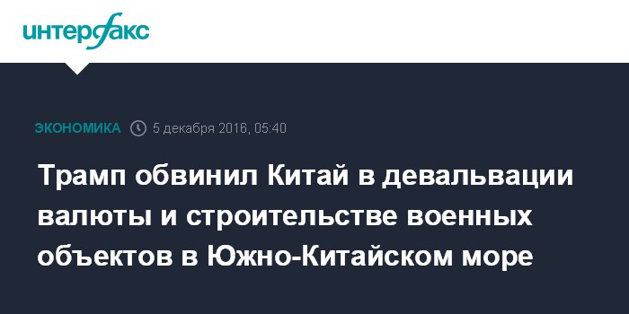 Москва. 5 декабря. INTERFAX.RU - Избранный президент США Дональд Трамп обвинил Китай в занижении курса национальной валюты, высоких налогах на американские товары и строительстве военных баз в спорных морских районах.
