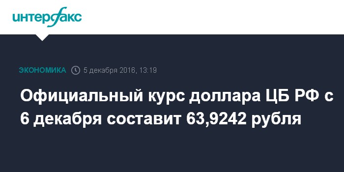 Официальный курс доллара ЦБ РФ с 6 декабря составит 63,9242 рубля