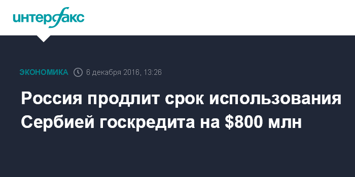Москва. 6 декабря. INTERFAX.RU - Россия готова пролонгировать на три года срок использования Сербией кредита объемом $800 млн, выданного в 2013 году под 4,1% годовых на модернизацию железнодорожной инфраструктуры страны, следует из распоряжения правительства на официальном интернет-портале правовой информации.