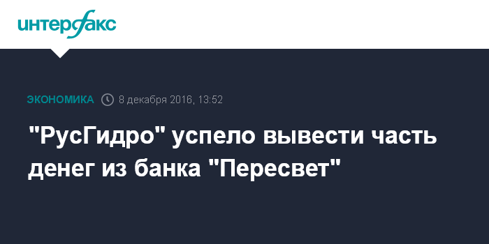 Москва. 8 декабря. INTERFAX.RU - ПАО "РусГидро" вывело часть средств из "Пересвета" до введения в банке временной администрации.