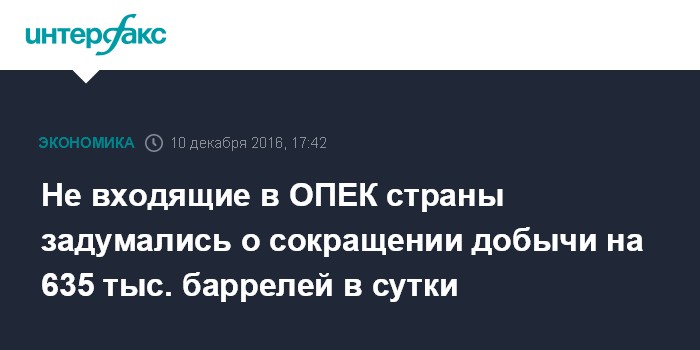 Как сообщалось, страны ОПЕК 30 ноября договорились сократить добычу нефти на 1,2 млн баррелей в сутки (до 32,5 млн баррелей в сутки) с января 2017 года при условии, что страны не входящие в ОПЕК страны сократят свою добычу на 600 тыс. баррелей, из которых 300 тыс. баррелей в сутки приходится на Россию.