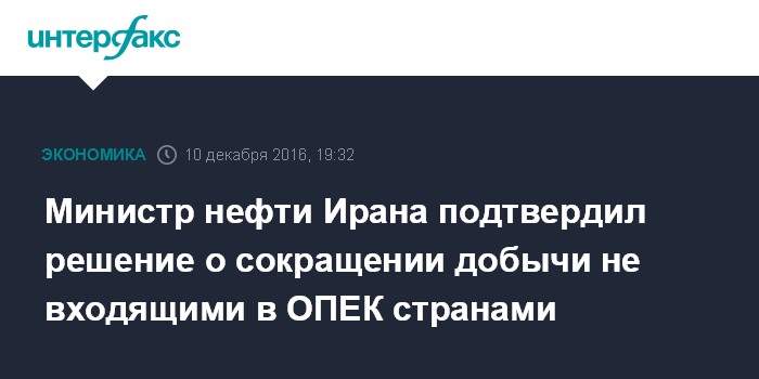 Москва. 10 декабря. INTERFAX.RU - Страны, не входящие в опер ОПЕК, сократят добычу нефти примерно на 600 тыс. баррелей в сутки, заявил министр нефти Ирана Бижан Намдар Зангане.
