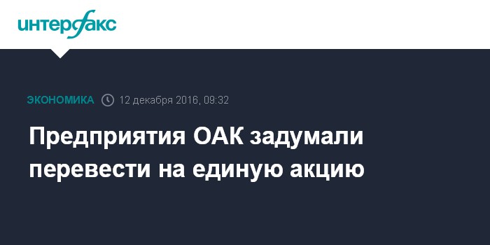 Москва. 12 декабря. INTERFAX.RU - Совет директоров ПАО "Объединенная авиастроительная корпорация" (ОАК) на заседании 8 декабря одобрил "дорожную карту" трансформации корпоративной структуры корпорации, а именно - переход на единую акцию, сообщает газета "Ведомости" в понедельник со ссылкой на трех федеральных чиновника.