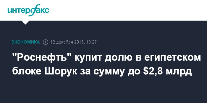 Москва. 12 декабря. INTERFAX.RU - Совет директоров НК "Роснефть" одобрил сделку по покупке "РН-Эксплорейшн" у IEOC Production B.V., гарантом которого выступает Eni International B.V., 30% доли в договоре концессии в отношении Блока Шорук в Египте (договор концессии).