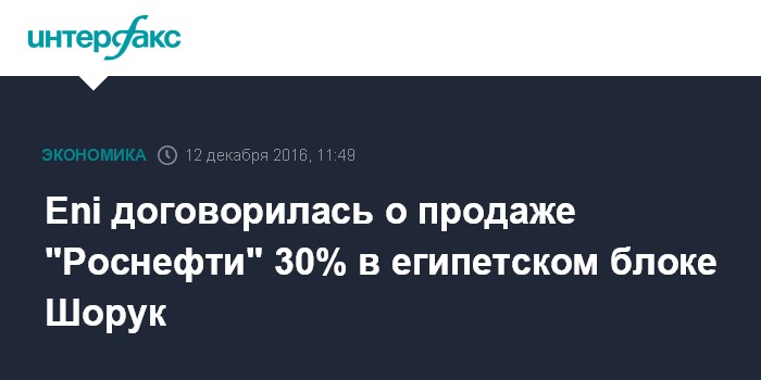 Москва. 12 декабря. INTERFAX.RU - Итальянская Eni договорилась о продаже "Роснефти" 30% участия в концессии по освоению блока Шорук на шельфе Египта, где открыто газовое месторождение Зохр, сообщила итальянская компания.