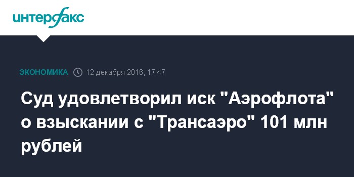 Москва. 12 декабря. INTERFAX.RU - Арбитражный суд Москвы в понедельник удовлетворил иск ПАО "Аэрофлот - российские авиалинии" о взыскании с ОАО "Авиационная компания "Трансаэро"101 млн рублей по договору поручительства от 25 декабря 2015 года, сообщили журналистам в суде.