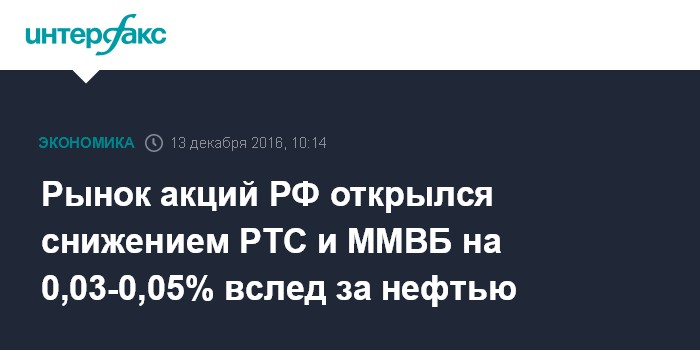 Москва. 13 декабря. INTERFAX.RU - Рынок акций РФ открылся во вторник смешанной динамикой цен blue chips на фоне стагнации мировых площадок и коррекции нефти вниз, индексы РТС и ММВБ за минуту торгов просели на 0,03-0,05%.