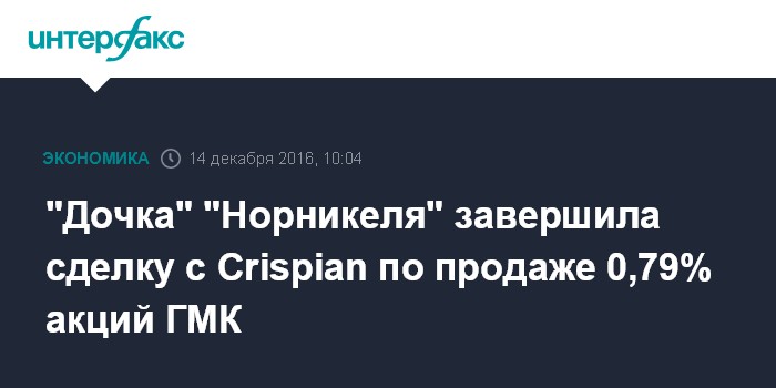 "Дочка" "Норникеля" завершила сделку с Crispian по продаже 0,79% акций ГМК
