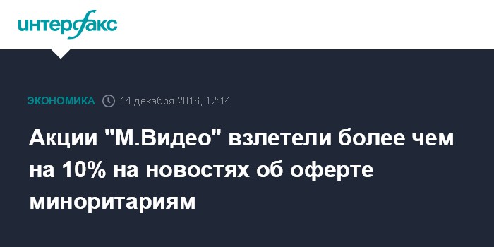 Москва. 14 декабря. INTERFAX.RU - Акции "М.Видео" днем в среду взлетели более чем на 10% и обновили исторические максимумы на новостях, что основные владельцы ритейлера продают свои доли в компании группе "Сафмар" по цене $7 за акцию, а миноритариям будет предложена оферта.