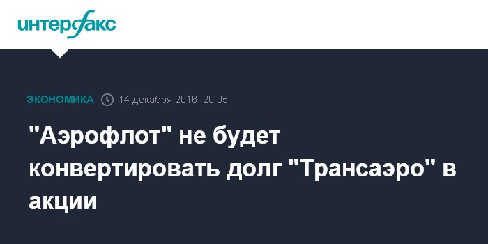 Москва. 14 декабря. INTERFAX.RU - "Аэрофлот" не будет конвертировать долг "Трансаэро" в акции, заявил гендиректор авиакомпании Виталий Савельев в эфире телеканала "Россия 24" в среду.