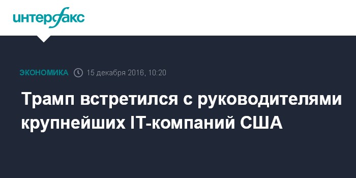 Москва. 15 декабря. INTERFAX.RU - Дональд Трамп встретился в Нью-Йорке с руководством ряда ведущих американских IT-компаний, говорится в коммюнике переходной команды избранного президента.