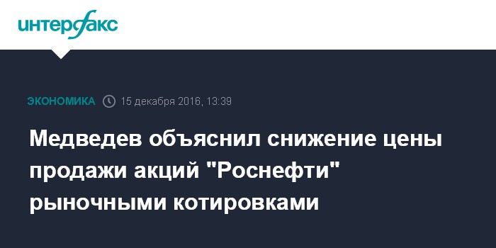 Москва. 15 декабря. INTERFAX.RU - Снижение цены продажи 19,5% акций "Роснефти" по сравнению с суммой, указанной в директиве правительства от ноября этого года, объясняется сокращением рыночных котировок, заявил премьер-министр России Дмитрий Медведев в интервью российским телеканалам.