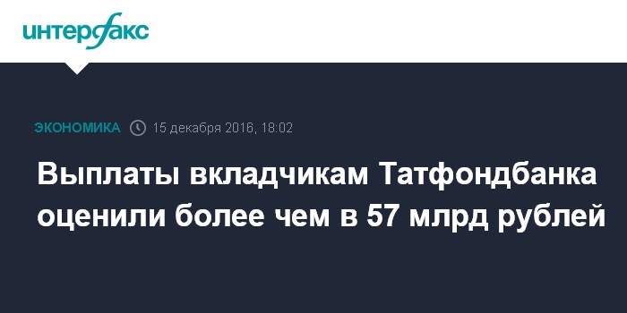 Москва. 15 декабря. INTERFAX.RU - Объем страховой ответственности Агентства по страхованию вкладов перед вкладчиками Татфондбанка может превысить 57 млрд рублей. Как сообщили агентству "Интерфакс" в АСВ, по данным официальной отчетности Татфондбанка на 1 октября общая сумма вкладов физических лиц в банке, в том числе индивидуальных предпринимателей, составляла 77 млрд рублей. Из этой суммы обязательства АСВ по выплате страхового возмещения составляли 57,6 млрд рублей.