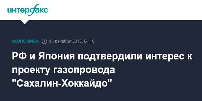 Москва. 16 декабря. INTERFAX.RU - Россия и Япония подтвердили взаимный интерес к проекту строительства газопровода "Сахалин-Хоккайдо", договорившись активизировать его проработку на уровне хозяйствующих субъектов, сообщила пресс-служба Минвостокразвития по итогам переговоров президента России Владимира Путина и премьер-министра Японии Синдзо Абэ в Нагато (префектура Ямагути). В переговорах, состоявшихся в четверг, принял участие министр РФ по развитию Дальнего Востока Александр Галушка.