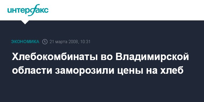 Владимир. 21 марта. INTERFAX.RU - ОАО "Владимирский хлебокомбинат" и ОАО "Вязниковский хлебокомбинат" заключили соглашение с администрацией Владимирской области о замораживании отпускных цен на ржано-пшеничный и пшеничный хлеб, сообщили в пятницу "Интерфаксу" в пресс-службе обладминистрации.