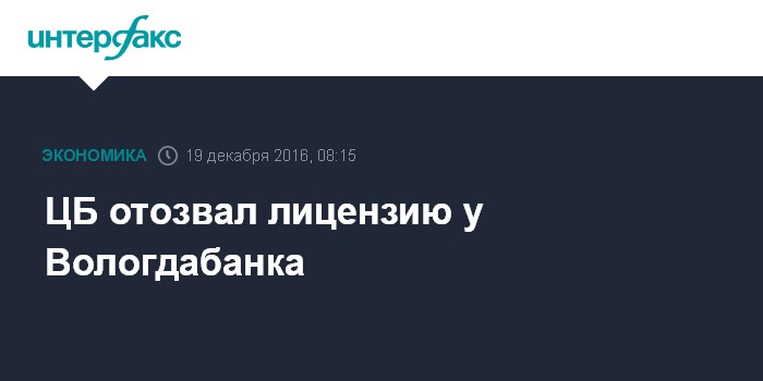 Москва. 19 декабря. INTERFAX.RU - Банк России отозвал лицензию на осуществление банковских операций у Вологдабанка (Вологда), говорится в сообщении регулятора. Лицензия отозвана с 19 декабря.