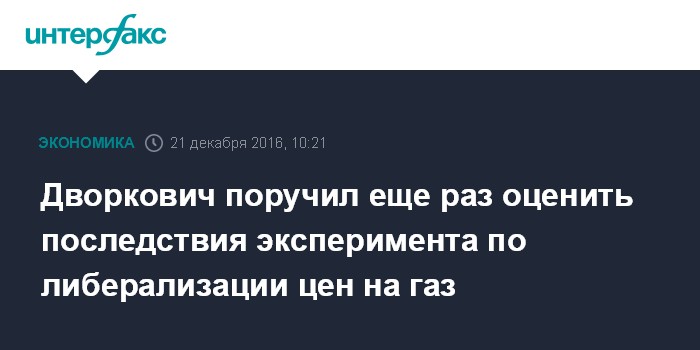 Москва. 21 декабря. INTERFAX.RU - Вице-премьер РФ Аркадий Дворкович по итогам заседания правкомиссии по ТЭК поручил ведомствам еще раз оценить последствия эксперимента по либерализации цен на газ в трех регионах, который, по задумке ФАС, должен был заработать уже с 2017 года.