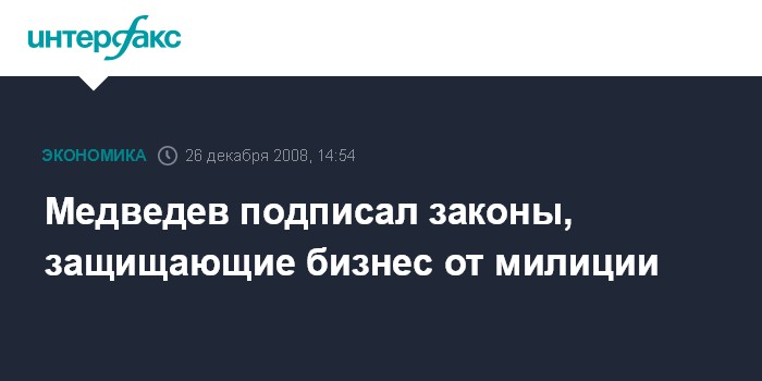 Москва. 26 декабря. INTERFAX.RU - Президент РФ Дмитрий Медведев сообщил, что подписал два закона, сокращающие количество проверок в отношении предпринимателей и исключающие внепроцессуальные действия МВД.