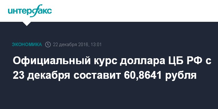 Москва. 22 декабря. INTERFAX.RU - Официальный курс доллара США, объявленный Банком России с 23 декабря, составляет 60,8641 рубля, сообщает пресс-служба Банка России. Таким образом, стоимость рубля, выраженная в долларах, по сравнению с предыдущим днем выросла на 0,40%.
