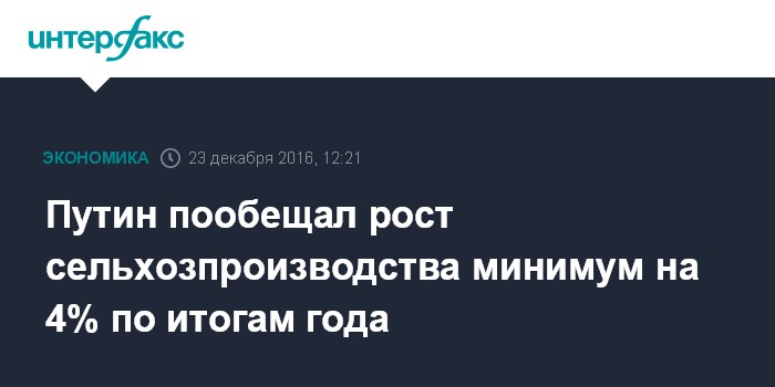 Москва. 23 декабря. INTERFAX.RU - Сельхозпроизводство в РФ в 2016 году вырастет минимум на 4%. "По сельскому хозяйству рост серьезный, он в прошлом году был 2,6%, в этом году мы планировали 3,2%. На данный момент времени - 4,1%, по году будет не меньше 4%", - сообщил президент РФ Владимир Путин на пресс-конференции в пятницу.