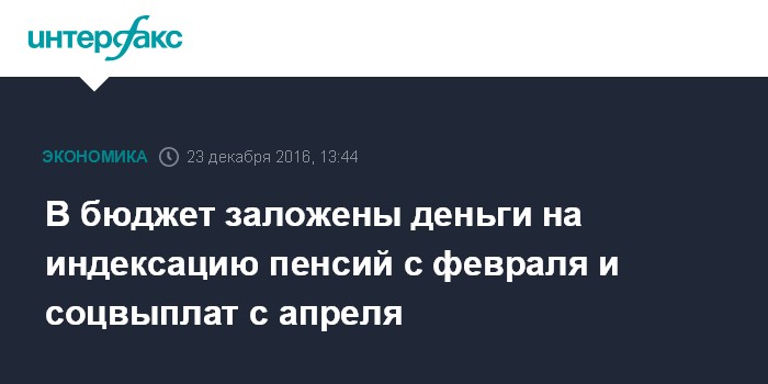 Москва. 23 декабря. INTERFAX.RU - В бюджете на следующий год заложены средства на индексацию пенсий с 1 февраля на уровень инфляции текущего года и на индексацию других социальных выплат с 1 апреля, заявил президент Владимир Путин.