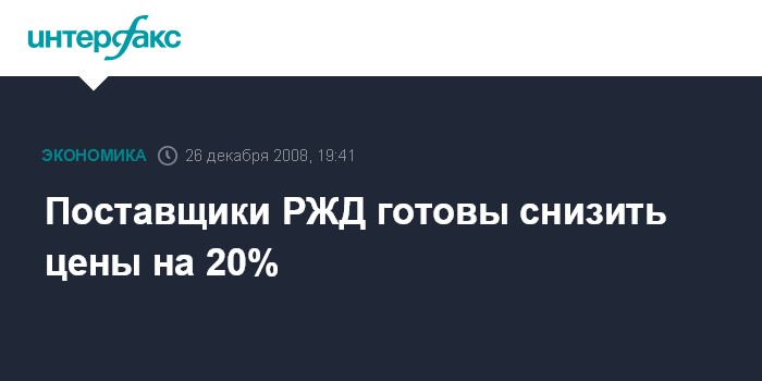 Москва. 26 декабря. INTERFAX.RU - Основные компании - поставщики продукции для РЖД заявили о готовности снизить цены в 2009 г. на 20%, заявил вице-премьер РФ Сергей Иванов.