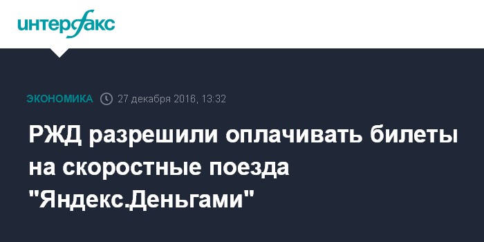 Москва. 27 декабря. INTERFAX.RU - ОАО "Российские железные дороги" со вторника разрешило оплачивать электронные билеты с помощью "Яндекс.Деньги" на сайте ж/д компании, говорится в ее сообщении.