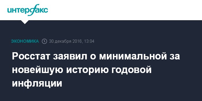Инфляция в декабре 2016 года оказалась ниже ожиданий аналитиков и Минэкономразвития. Консенсус-прогноз экономистов, опрошенных "Интерфаксом" в конце декабря, равнялся 0,6%, Минэкономразвития ожидало рост цен на уровне 0,5-0,7%. В целом за 2016 год инфляция составила минимальные за всю новейшую историю России 5,4% против 12,9% в 2015 году, 11,4% в 2014 году, 6,5% в 2013 году, 6,6% в 2012 году, 6,1% в 2011 году (показатель 2011 года был до этого как раз минимальным значением).