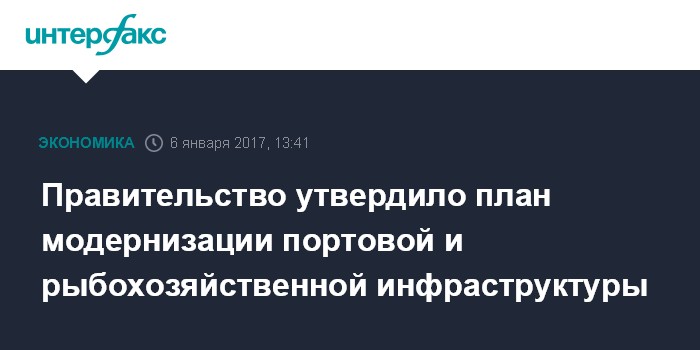 Москва. 6 января. INTERFAX.RU - Правительство РФ утвердило план мероприятий по модернизации и развитию портовой и рыбохозяйственной инфраструктуры. Соответствующее распоряжение опубликовано на сайте правительства.