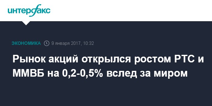 Москва. 9 января. INTERFAX.RU - Рынок акций РФ открылся в понедельник цен blue chips на фоне позитивной динамики мировых фондовых площадок, индексы РТС и ММВБ за минуту торгов прибавили 0,2-0,5%.