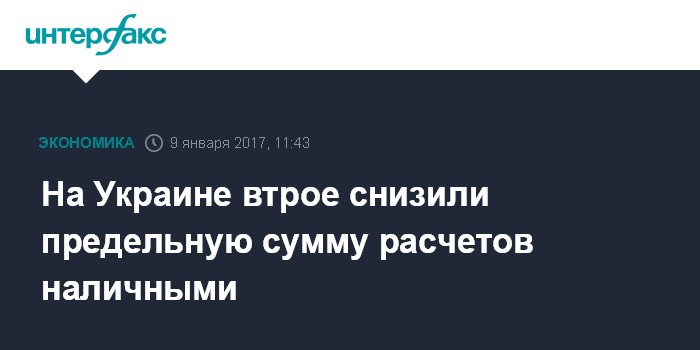Москва. 9 января. INTERFAX.RU - Предельная сумма расчетов наличными с участием физических лиц с 4 января 2017 года снижена втрое - со 150 тысяч гривен до 50 тысяч гривен, соответствующие правки Национальный банк Украины (НБУ) утвердил своим постановлением, которое опубликовано на его сайте.