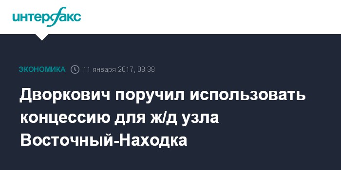 Москва. 11 января. INTERFAX.RU - Вице-премьер РФ Аркадий Дворкович поручил министерству транспорта РФ использовать механизм концессии для проекта железнодорожного узла Восточный-Находка, пишет в среду "Коммерсант" со ссылкой на протокол соответствующего совещания 26 декабря 2016 г.