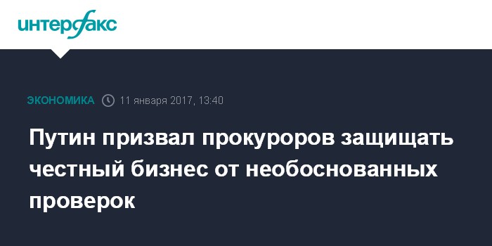 Москва. 11 января. INTERFAX.RU - Добросовестный бизнес должен быть надежно защищен государством и прокуратура должна продолжать работу на этом направлении, заявил президент РФ Владимир Путин.