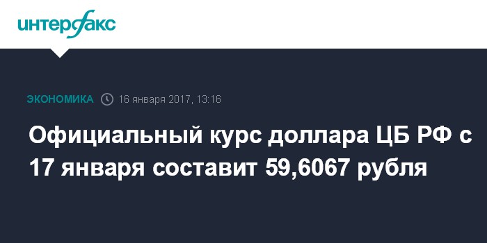 Москва. 16 января. INTERFAX.RU - Официальный курс доллара США, объявленный Банком России с 17 января, составляет 59,6067 рубля, сообщает пресс-служба Банка России. Таким образом, стоимость рубля, выраженная в долларах, по сравнению с предыдущим днем снизилась на 0,40%.
