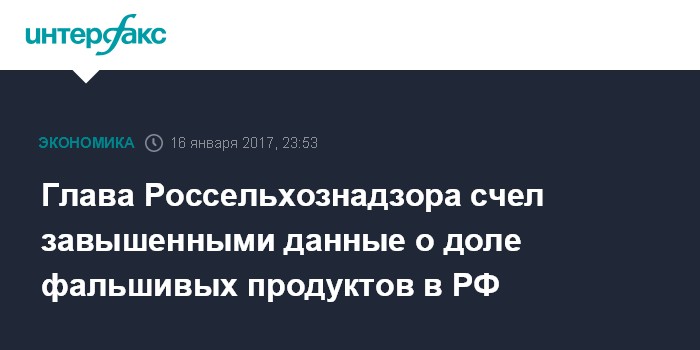 Москва. 16 января. INTERFAX.RU - Глава Россельхознадзора Сергей Данкверт считает преувеличенными данные о том, что в РФ подделывается до четверти продовольствия. Но вместе с тем он отметил, что проблема фальсификации есть. Об этом глава ведомства сказал в интервью телеканалу "Россия 24", вышедшем в эфир в понедельник.