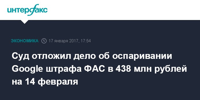 Москва. 17 января. INTERFAX.RU - Арбитражный суд Москвы отложил на 14 февраля дело по оспариванию Google основного штрафа Федеральной антимонопольной службы (ФАС) в 438 млн рублей за нарушение конкуренции на рынке предустановленных мобильных приложений в России, сообщил "Интерфаксу" представитель ФАС.