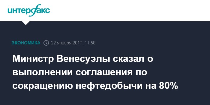 Москва. 22 января. INTERFAX.RU - Договоренности по сокращению нефтедобычи между странами ОПЕК и не-ОПЕК сейчас выполнены уже на 80%, сообщил журналистам министр нефти Венесуэлы Нельсон Мартинес.