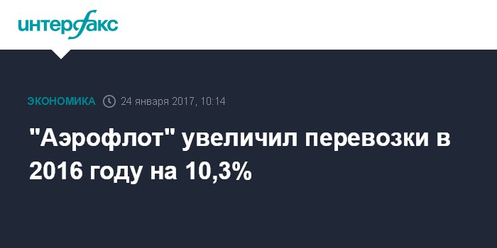 За весь 2016 год авиакомпания "Аэрофлот" увеличила перевозки на 11%, до 28,98 млн человек. На внутренних линиях показатель достиг 14,1 млн человек (+11,4%), на международных - 14,87 млн человек (+10,6%). Пассажирооборот вырос на 11,6%, до 82,69 млрд пассажиро-километров. Процент занятости пассажирских кресел повысился на 2,0 процентных пункта, до 81,3%.
